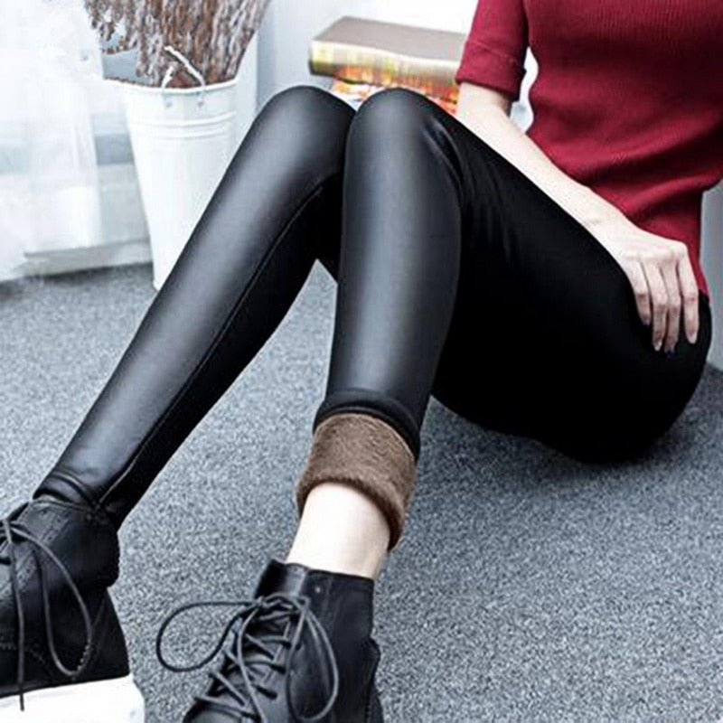 Warm Pu Leggings Women Leather Pantalones High Waist Thermal Tights Stretchy Pants Winter Fleece Lined Black Trousers Jeggings