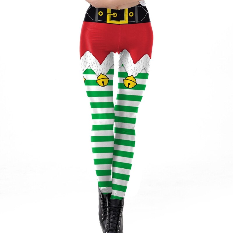 Women Ugly Christmas Fake Elf Shorts Print Leggings Funny Belt Striped Santa Holiday Tights Mid Rise Xmas Festival Cosplay Pants